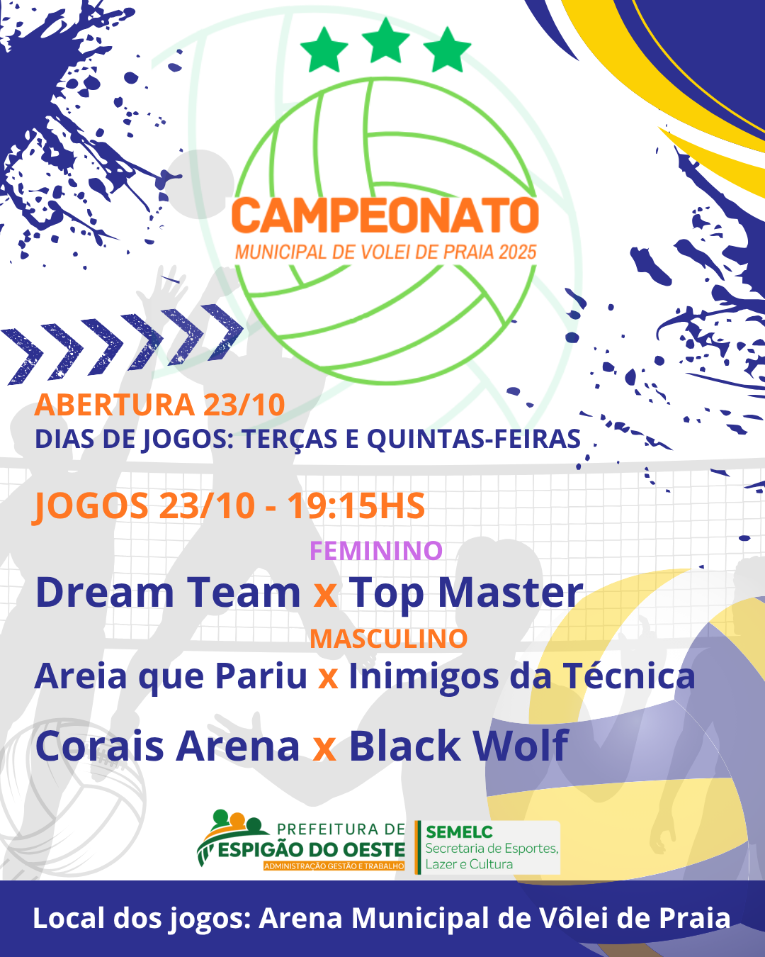 Mais um grande evento esportivo organizado pela Prefeitura de Espigão do Oeste, por meio da Secretaria Municipal de Esporte, Cultura e Lazer (SEMELC), promete agitar as areias da Arena Municipal de Vôlei de Praia!