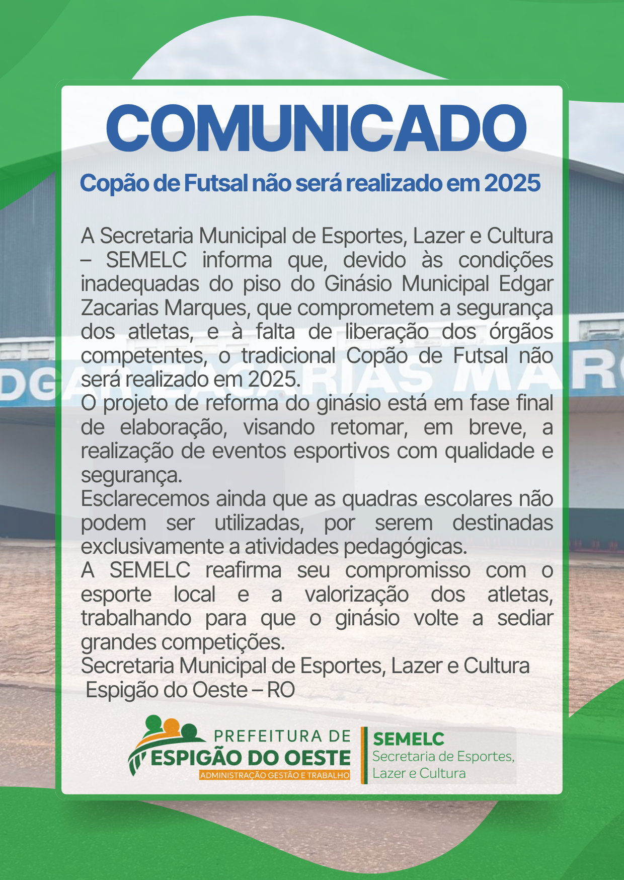 A Secretaria Municipal de Esportes, Lazer e Cultura – SEMELC informa que, devido às condições inadequadas do piso do Ginásio Municipal Edgar Zacarias Marques, que comprometem a segurança dos atletas, e &ag...
