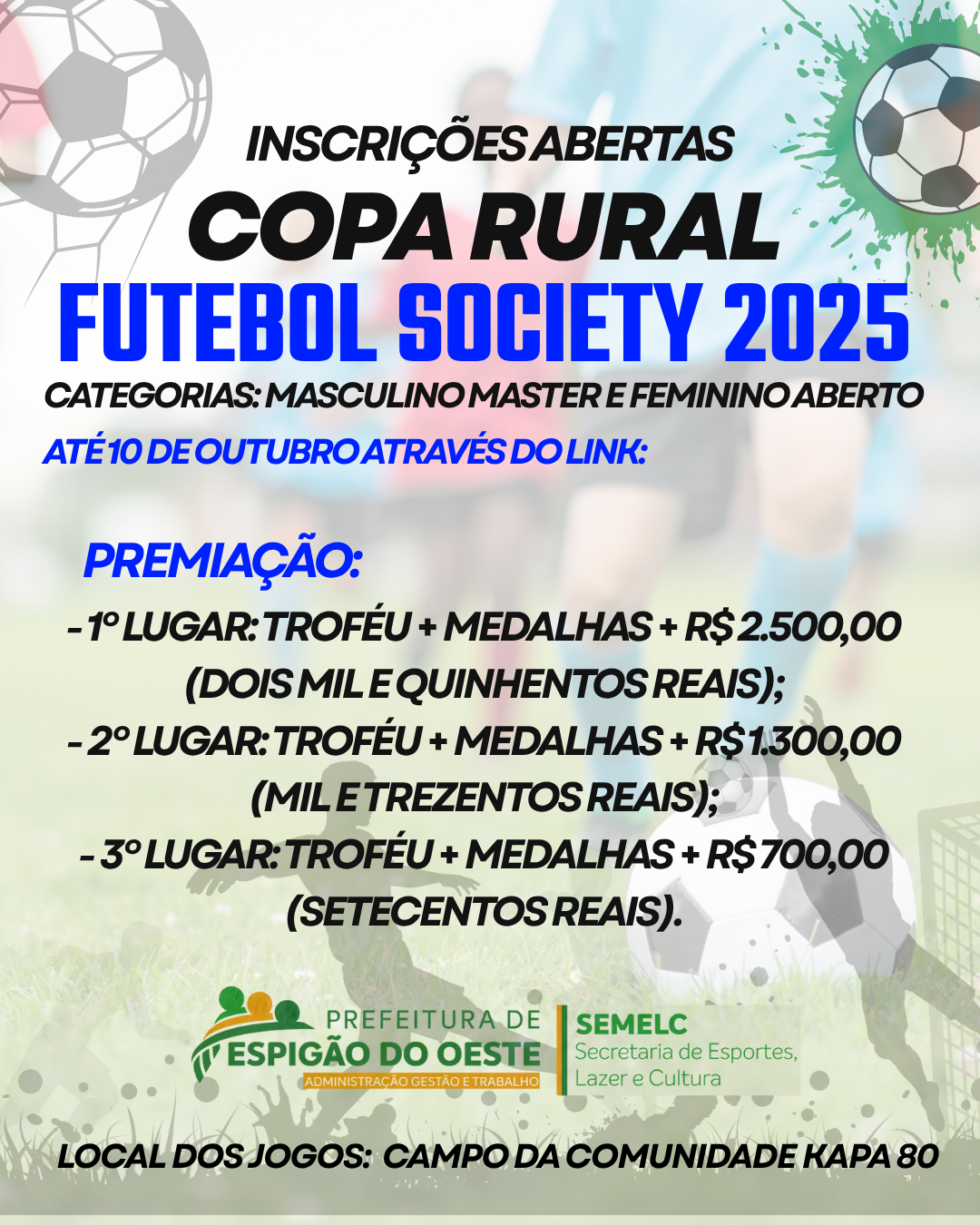 A Secretaria Municipal de Esporte, Cultura e Lazer abre oficialmente as inscrições para a Copa Indígena de Futebol Society 2025! Chegou a hora de reunir sua equipe e mostrar talento, ...