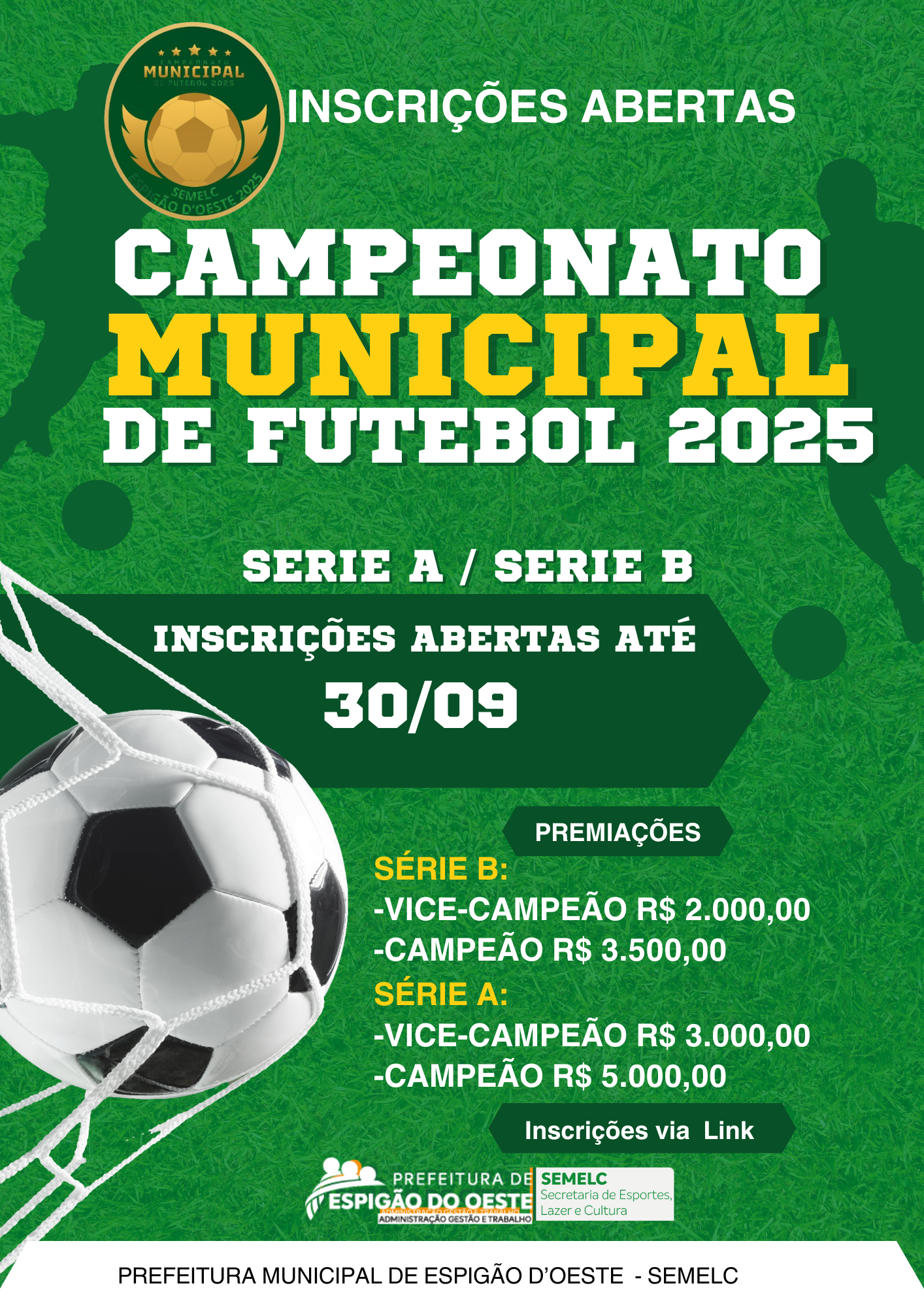 A competição mais aguardada do ano está chegando! As inscrições para o Campeonato Municipal de Futebol 2025 já estão ABERTAS! Monte sua equipe e partic...